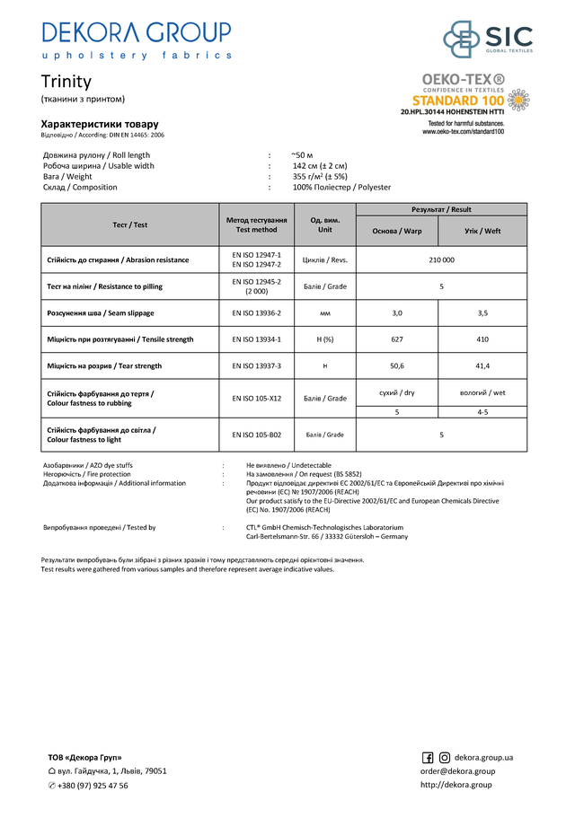 Стійкість до стирання – 210 000 циклів, ширина тканини – 142 см, довжина рулону – 50 м, щільність – 355 г/м², склад – 100% поліестер.